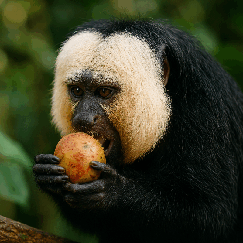 食性は果実中心ですが、特に硬い殻を持つ果実や種子を割って食べる能力に優れています。この特徴により、シロガオサキは「種子散布者」として森の生態系に大きく貢献しています。実際に彼らが食べた種は排泄後に発芽し、森林再生に役立つと報告されています。
