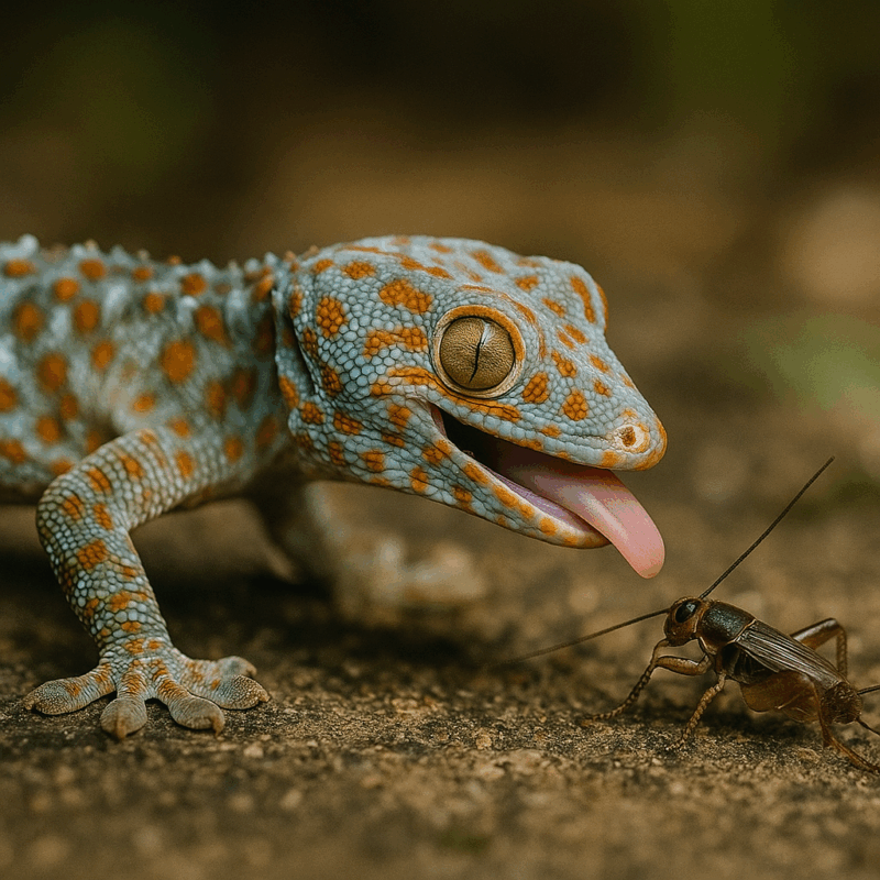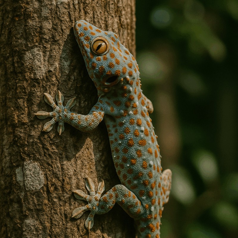 • トッケイヤモリ(Gekko gecko)は東南アジア原産の大型ヤモリで、体長は最大35センチに達する。夜行性で壁や天井に登る力を持ち、都市部でも見られるほど環境適応力が高い。