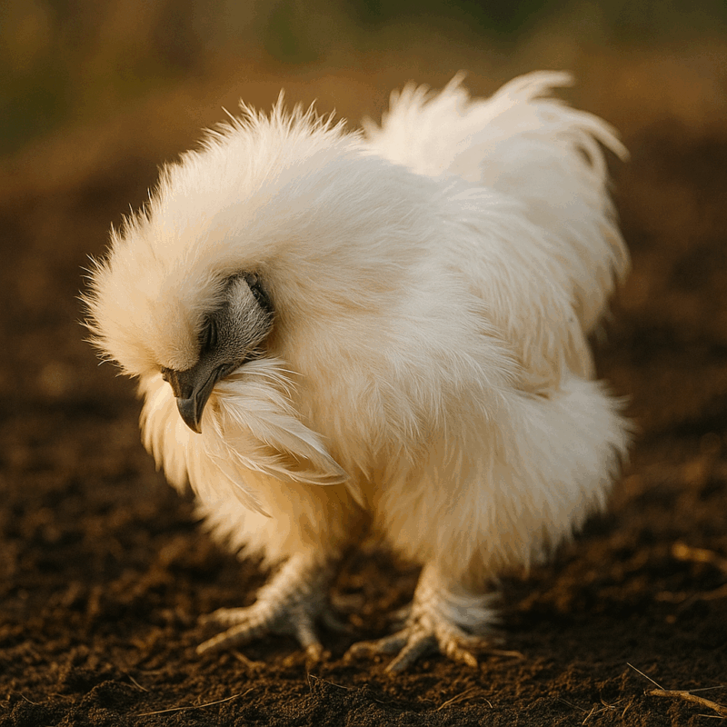羽毛は白くふわふわしており、まるで綿毛のような質感があるため、海外では“Silkie(シルキー)”とも呼ばれます。