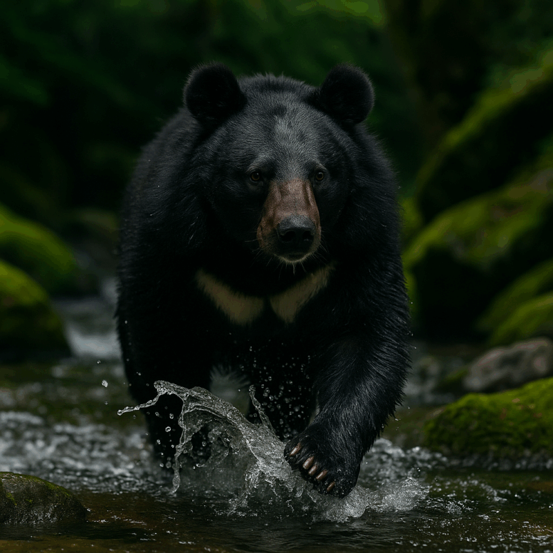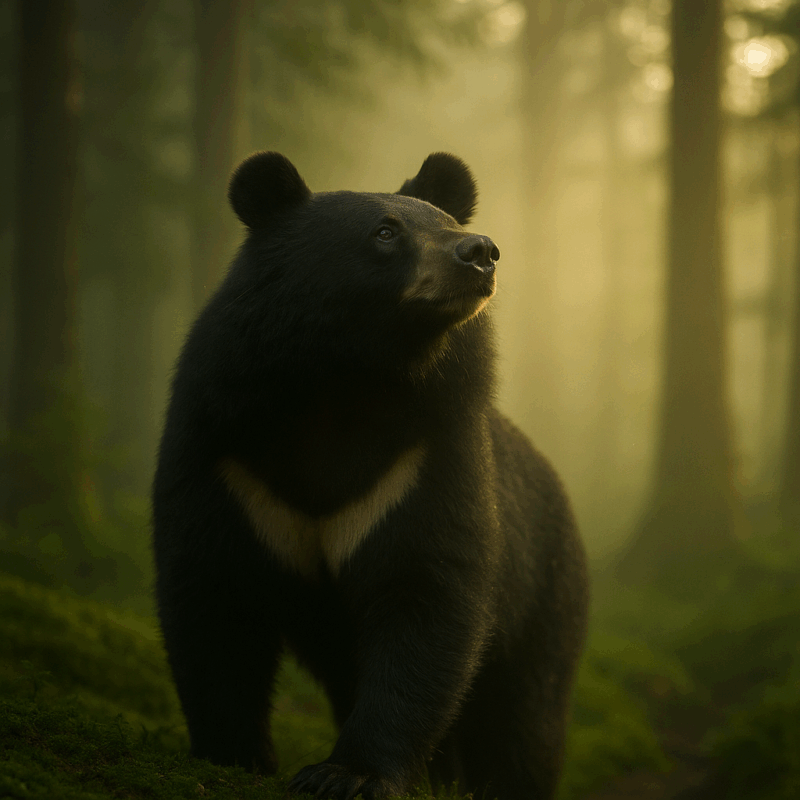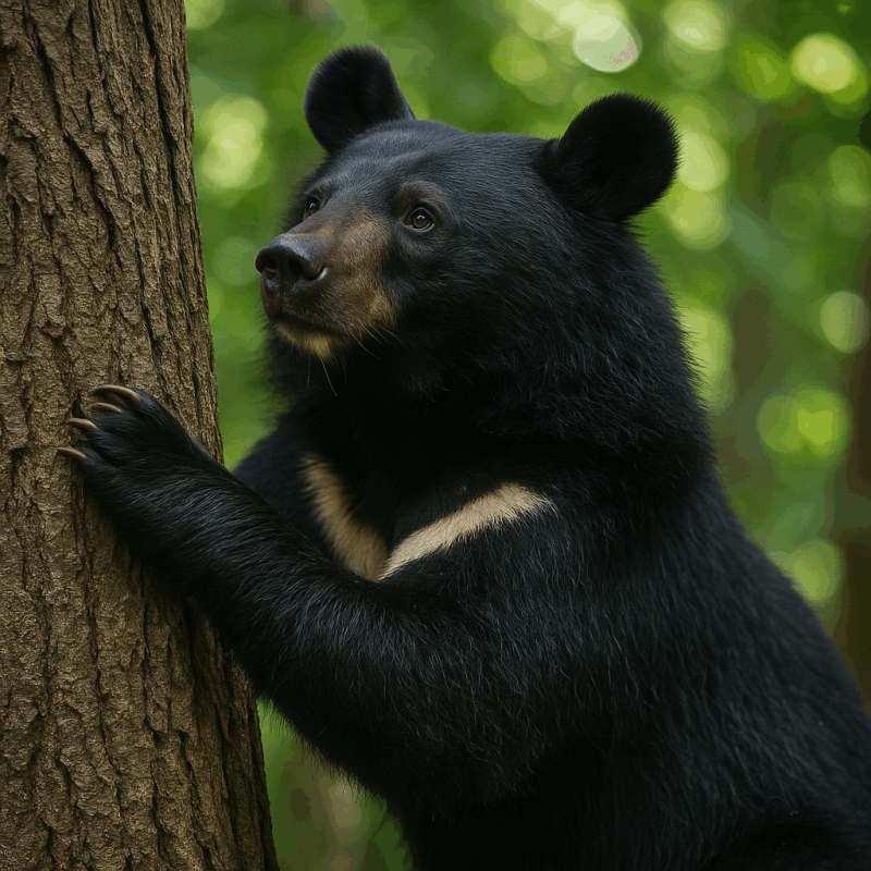 - ツキノワグマは日本固有の亜種で、本州と四国に生息する中型のクマ。胸の「月の輪」模様が特徴で、森の環境に深く適応して生きている。