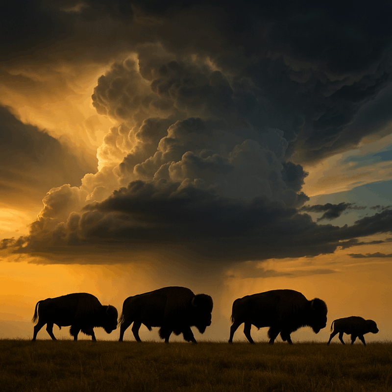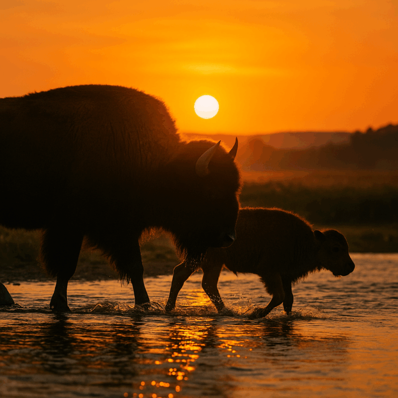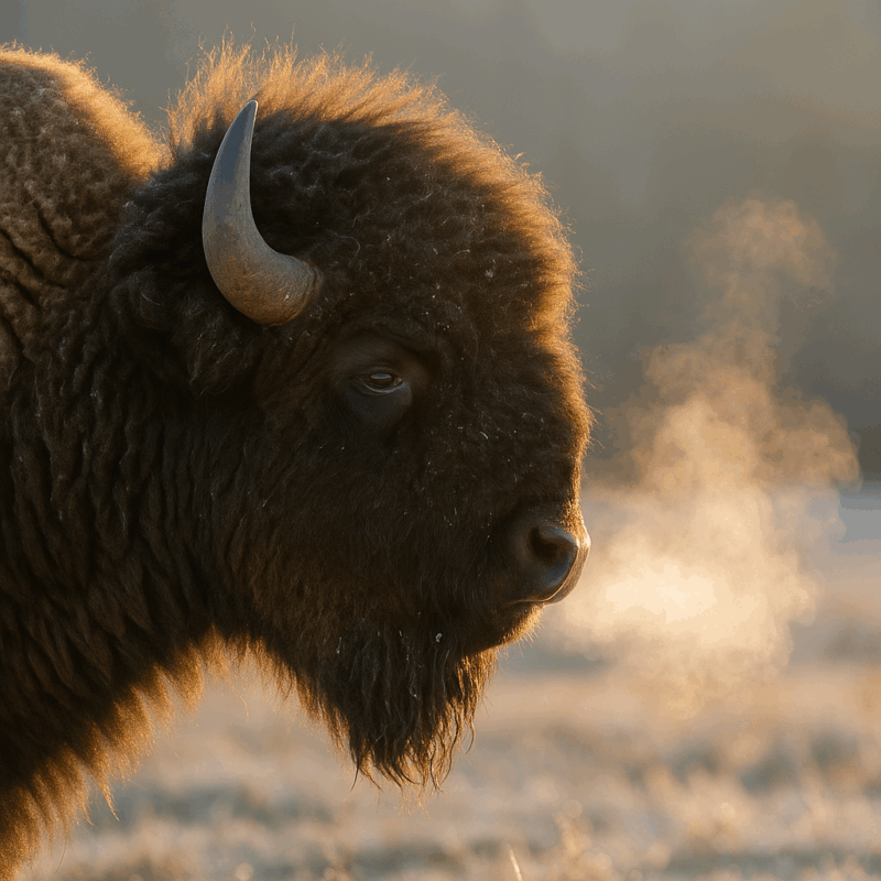 また、バイソンは草食動物でありながら、肉食動物に対して強い防御力を持っています。オオカミやグリズリーベアが襲っても、群れで囲み、角を使って反撃します。特に子どもを守るときは、メスが円を作り、中央に子バイソンを隠して守る姿が観察されています。