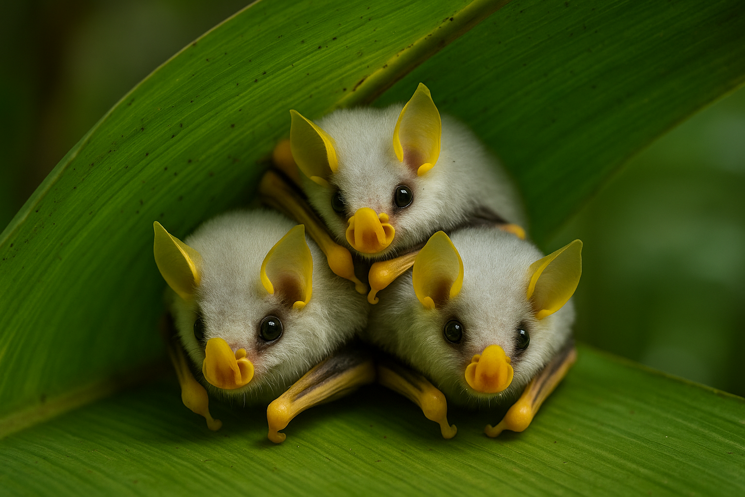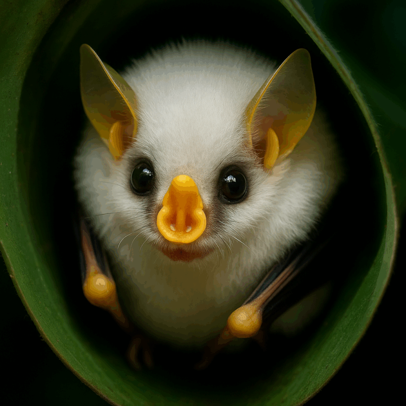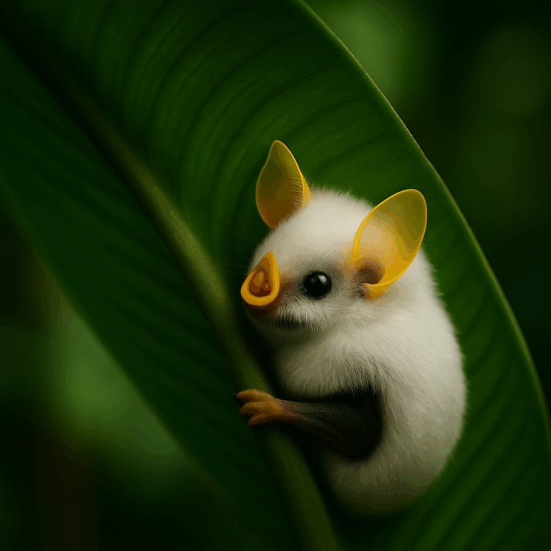 シロヘラコウモリは、コスタリカ・パナマ・ニカラグアの一部地域に生息する、体長4〜5cmほどの非常に小さなコウモリです。全身が白い毛で覆われ、黄色い鼻葉(はなよう)と耳を持つことで知られています。白い体色は熱帯雨林の葉の隙間から差し込む光を反射し、周囲の明るさに溶け込むための隠蔽効果があると考えられています。