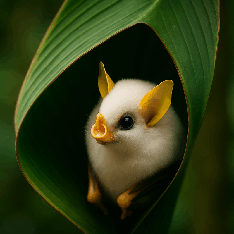 シロヘラコウモリの習性を理解するうえで最も重要なのは、彼らが“葉っぱのテント”を生活の中心にしているという点です。大きくしなやかな葉を折り曲げ、その内部に空間をつくり、そこで休息します。このテントは雨や日差しを防ぐだけでなく、白い体が光を反射して周囲に溶け込むための隠れ場所としても機能しています。つまり、体色と生活環境がセットで生存戦略を形成しているのです。