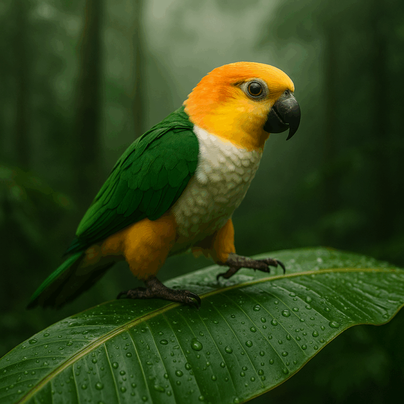 シロハラインコは、アマゾン周辺の熱帯林に生息する中型インコで、学名は Pionites leucogaster といいます。分布はブラジル北部〜中部が中心で、ペルー東部やボリビア北部の森林にも生息しており、主にアマゾン川の南側に広く見られる種類です。体長は約23cmほどで、丸みのある体つきと鮮やかな彩色が特徴的です。胸の白さと腹部のオレンジ色が対照的で、名前の「シロハラ(白腹)」はこの色から来ています。
