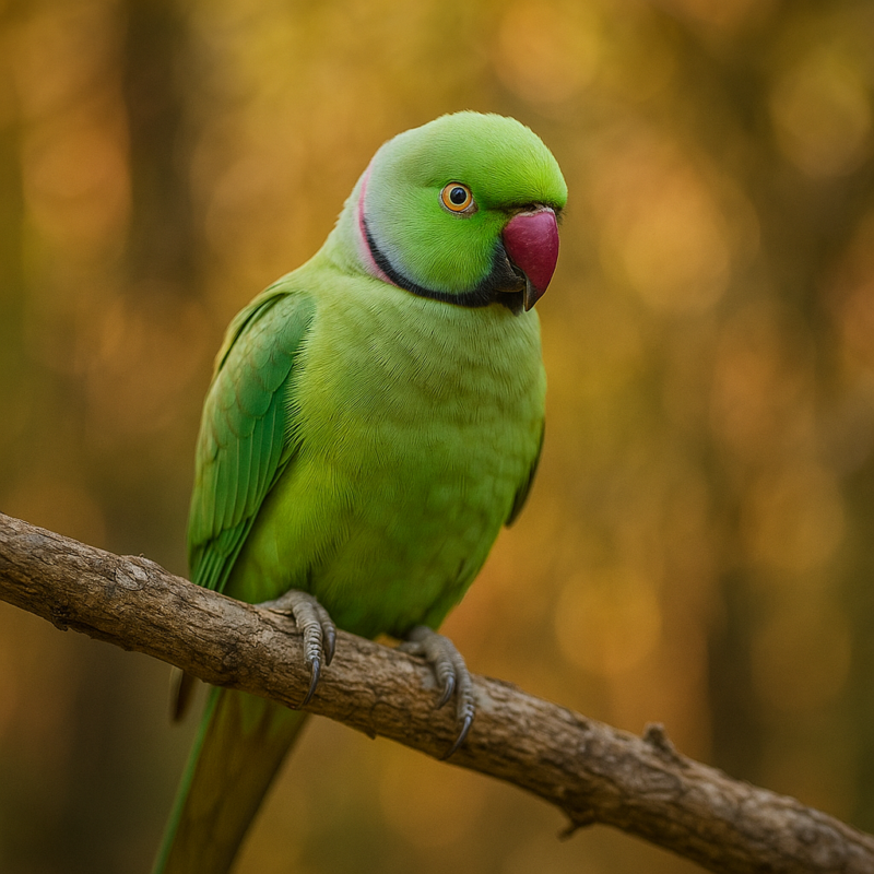 ワカケホンセイインコは、インド・パキスタン・スリランカを中心に分布する中型インコで、学名は Psittacula krameri manillensis とされています。体の長さは約40cmほどで、そのうち半分以上を尾羽が占める、非常に細身でしなやかな体つきが特徴です。