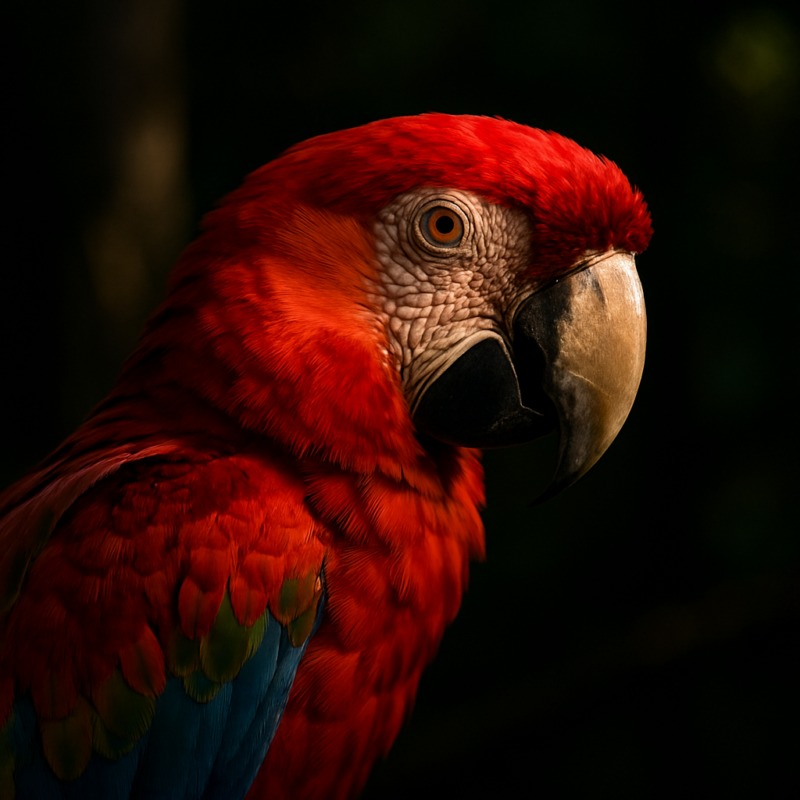 ベニコンゴウインコの最大の特徴は、全身を覆う赤色を基調とした鮮やかな羽色です。