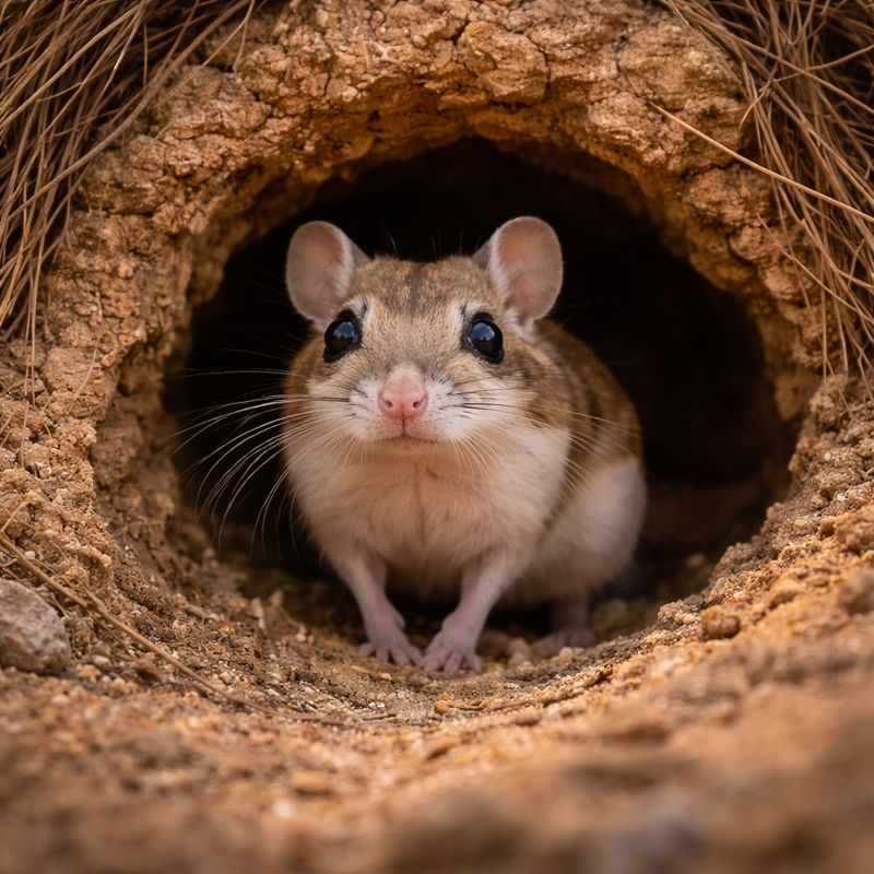 巣穴は単なる寝床ではなく、生活のベースキャンプです。カンガルーネズミは巣穴の中で休み、危険を感じたらすぐに戻れるように行動します。巣穴の中は外よりも温度変化が穏やかで、湿度も比較的安定しやすいため、体の水分を守る意味でも重要です。