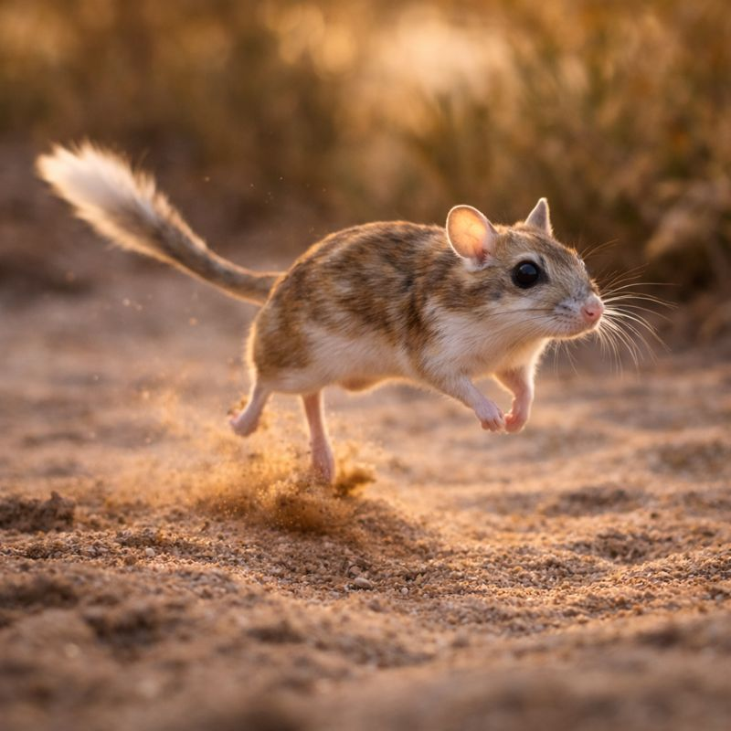 カンガルーネズミの一番分かりやすい特徴は、「後ろ足でジャンプしながら移動すること」です。前足は短く細く、後ろ足は長くて筋肉質になっていて、まさに跳ぶための体といえます。長い尻尾はバランスを取る“舵(かじ)”のような役割を持ち、急な方向転換にも対応しやすい構造です。